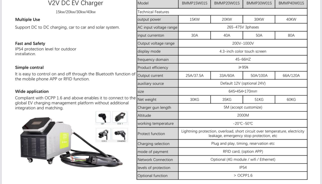 Input Voltage : 260-475V (3P+N+PE) Input Current : 32A-50A Frequency : 50/60HZ Output Voltage : (200-1000V) Output Power : 20kw LCD: 4.3IN Touch screen Operating Temperature : -20~50 IP Level: IP54 Cable Length : 5m