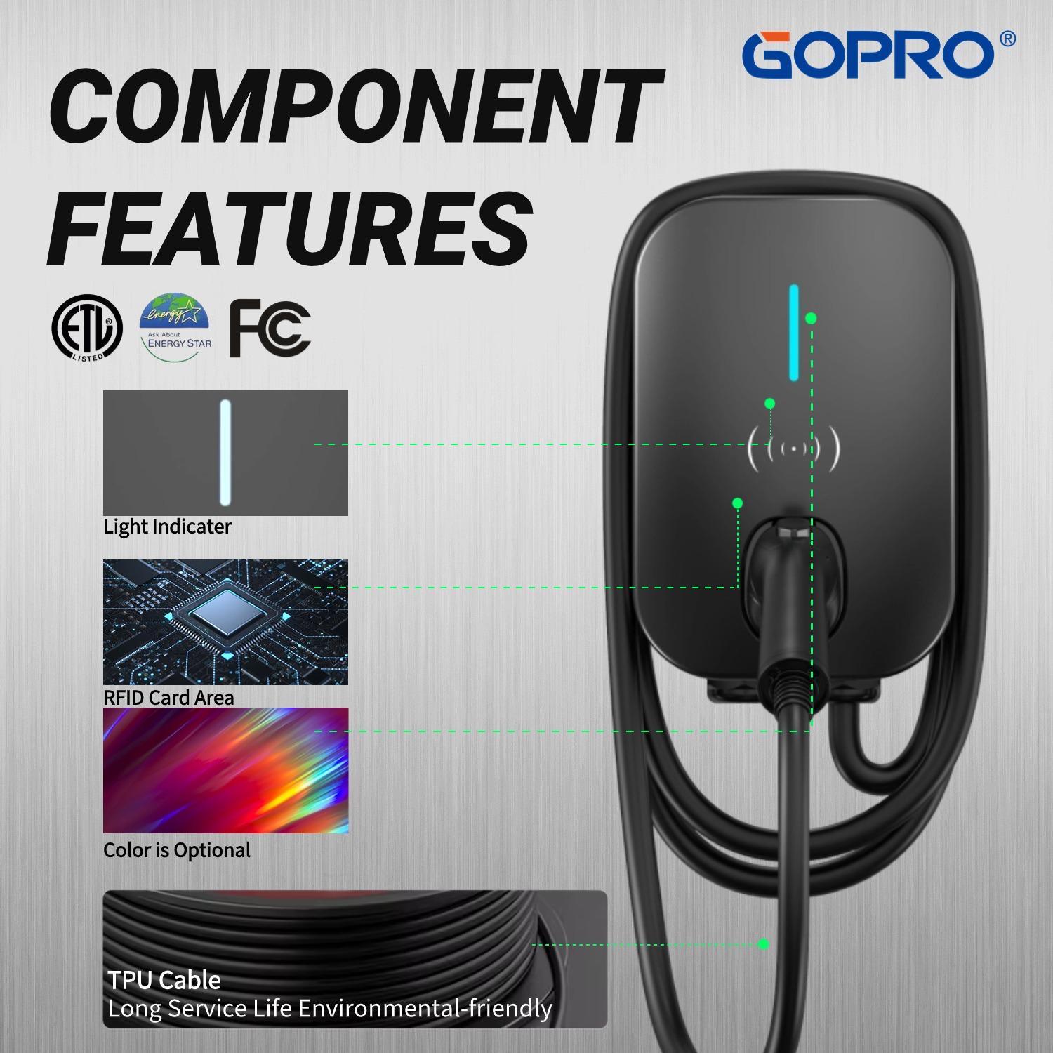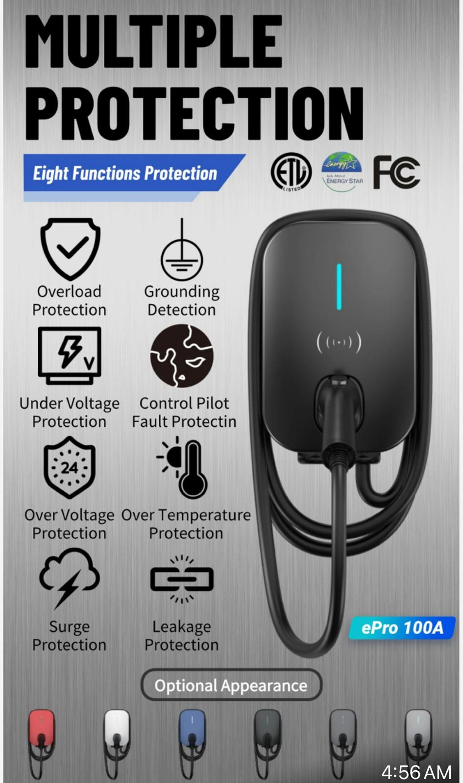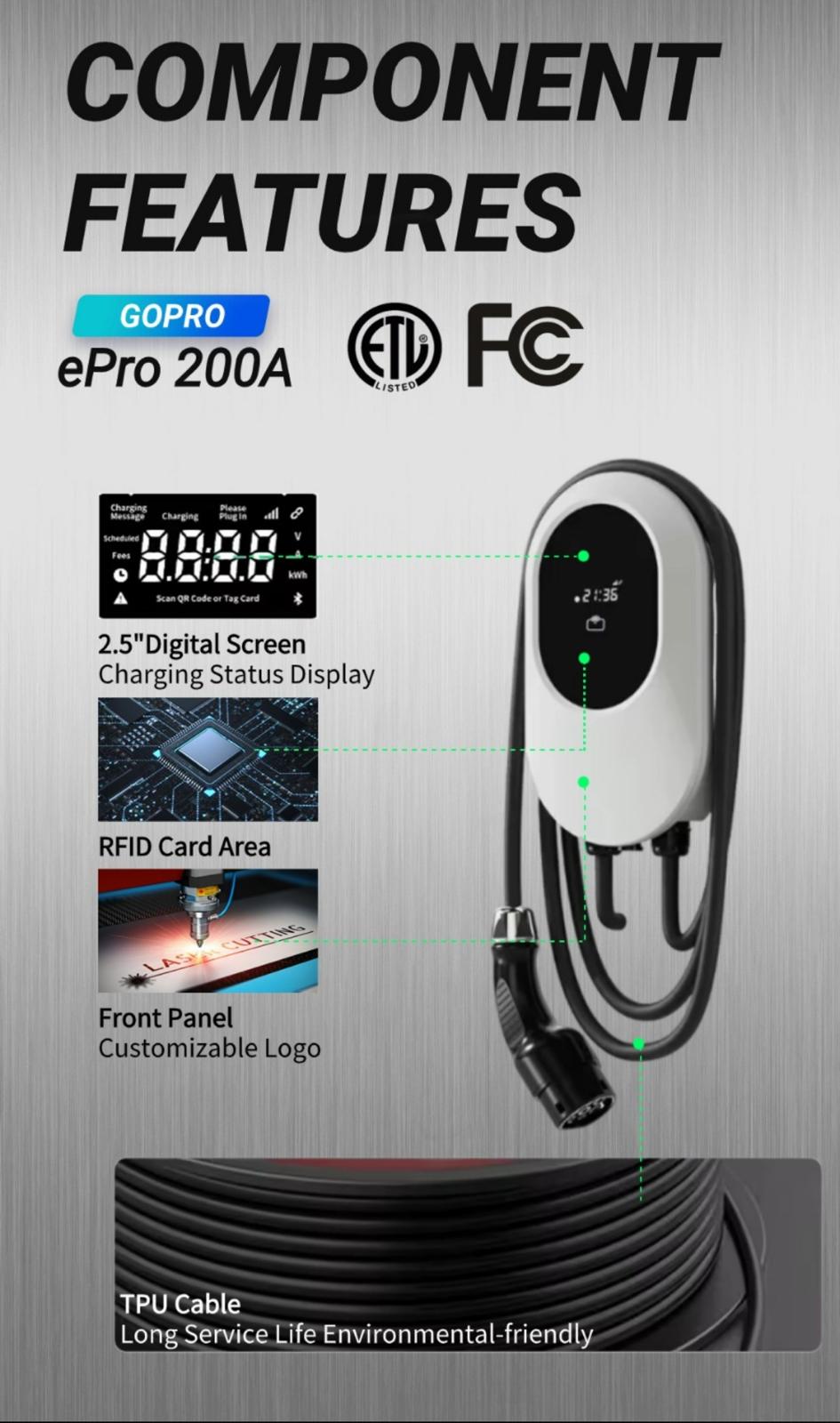 Power / Amperage: 11.5KW/ 48A Voltage:240Vact15% L1/L2/PE Frequency:50-60HZ Cable Length:5M User Authentication RFID (ISO 14443) Charging Interface: Type1 plug Network: LAN Standard-Wi-Fi,BT,OCPP RCD:CCID 20 Multiple Protection: UVP, OVP, RCD, SPD, Ground Fault Protection, OCP, OTP, Control Pilot Fault Protection